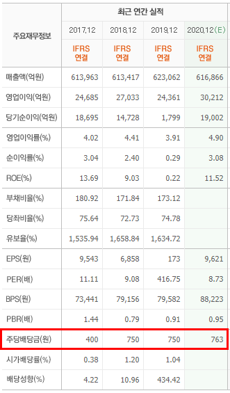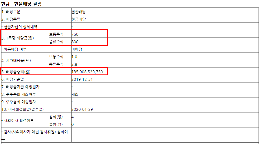 위의 현금 현물배당 결정표를 보시면 1주당 보통주식은 750원 우선주는 800원 입니다. 배당금총액은 1조3천억원 정도 입니다. 배당기준일이 계속 나오는데 중요합니다. 기준일 전 보유한 주식에 한해 적용되는 표이기 떄문이죠.