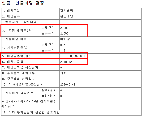위의 현금/현물 배당 결정 표를 보시겠습니다. 위의 표 6번 항목에 배당 기준일이 있습니다. 19년 12월 31일 입니다. 매년 12월 31일을 기준으로 하고 있습니다.